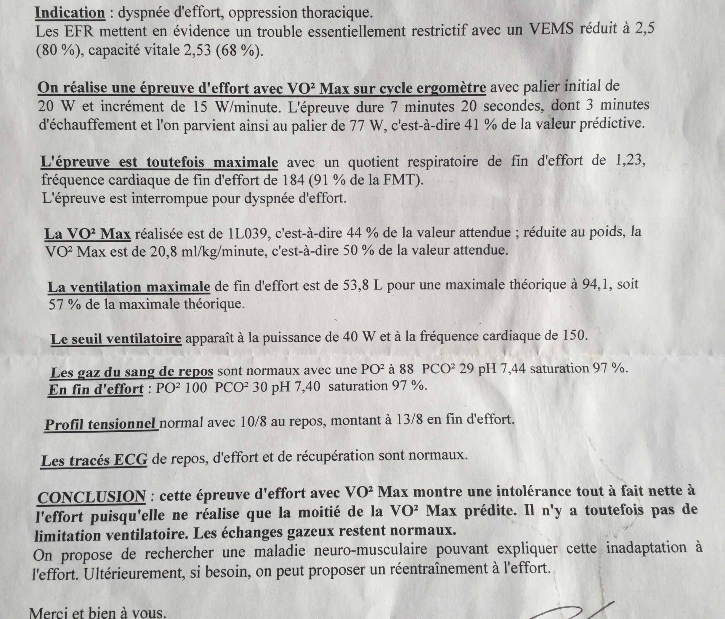 Je comprends un peu mieux merci ! Mais alors pourquoi mes gazs de sang au repos et effort sont normaux ? Et mes tracés ECG repos, effort, récupération aussi ?.. Ca prouverait donc bien que je fabule.. J'ai arreté l'épreuve pas à cause de mon souffle ou mon coeur, mais parce que j'avais plus de force dans mes muscles, ca me dégommait D'où la raison pour laquelle il m'avait redirigé vers un neurologue en cas de maladie neurosmusculaire ! Inexistante.. Et sinon oui, le sport et moi ça fait 18  donc j'ai tendance à vivre une vie loin des trucs extrêmes, rapides, sportif  le yoga c'est bien  Je ne savais pas qu'il y en avait un à Besancon.. j'étais allé sur Mulhouse, c'est bon à savoir ! Merci ! Je devrais peut être rouvrir le chaptire de ce PE.. meme si ca me terrorise..  Voila le bilan tu comprendras peut etre mieux que moi..
